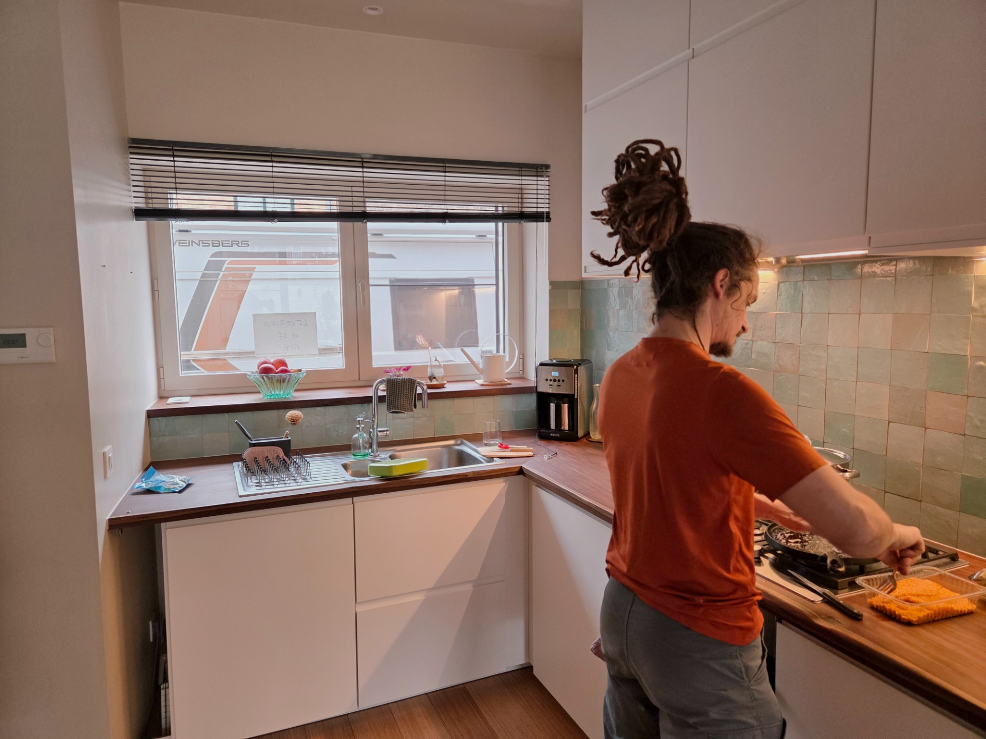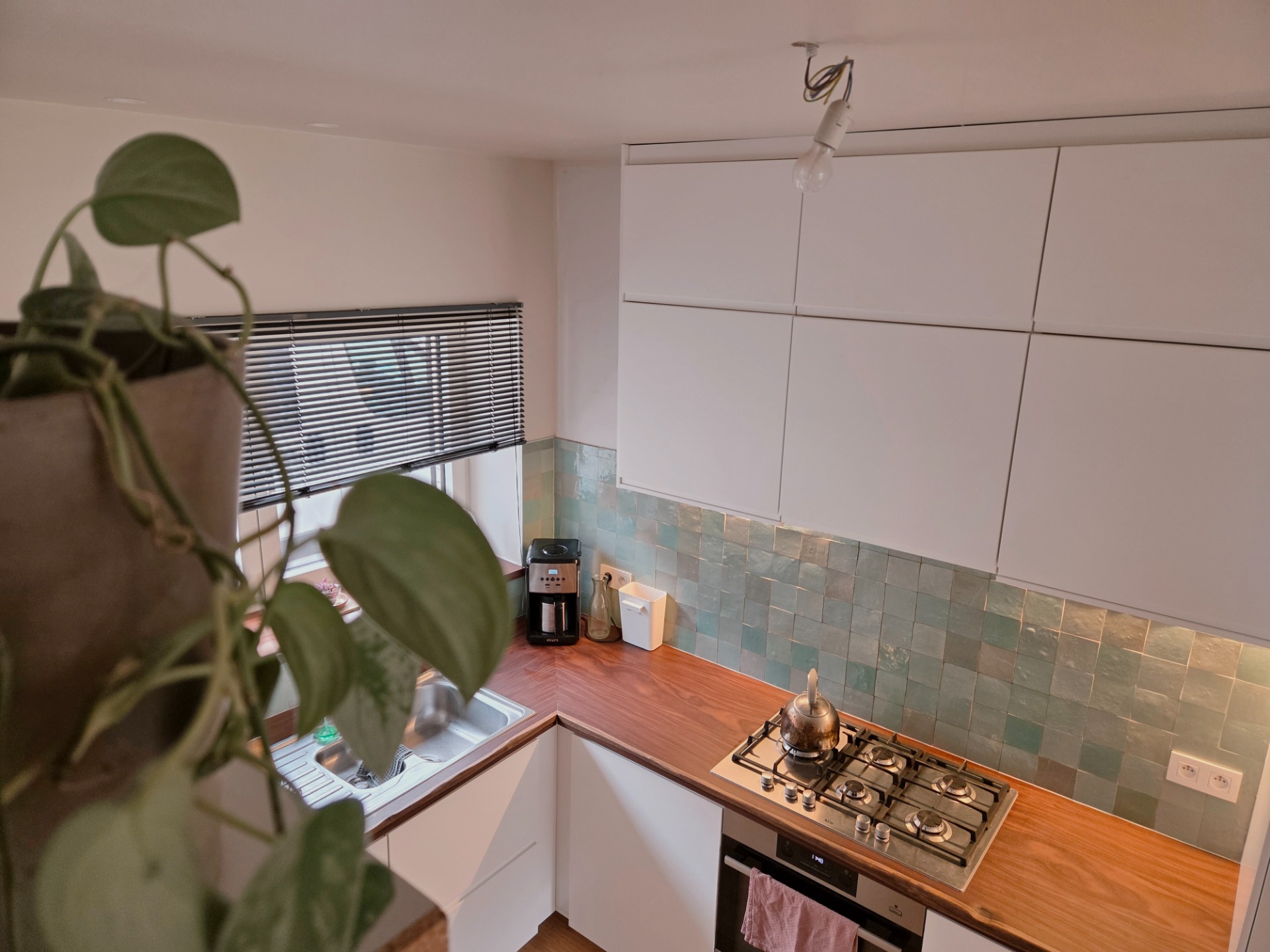 Onze keuken is klein. Er zijn weinig lades, wat ik jammer vind want ik organiseer graag met lades. Er is geen eiland. De living en keuken lopen in elkaar over. Keuzes die ik nu misschien anders zou doen.