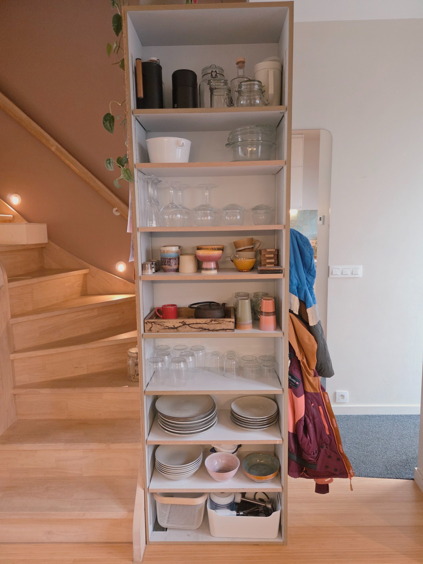 In de voorraadkast werken we met zones: bakken, droge voeding, conserven, snacks, brood en ontbijt, aardappelen en uien. Wat laag staat zit in manden die je eruit trekt, mijn oplossing voor het ladetekort. Wat hoger staat zit in doorzichtige bokalen, zodat ik in één oogopslag zie wat er is.